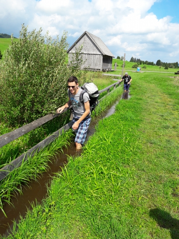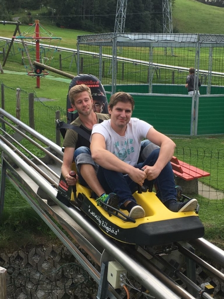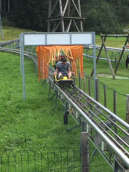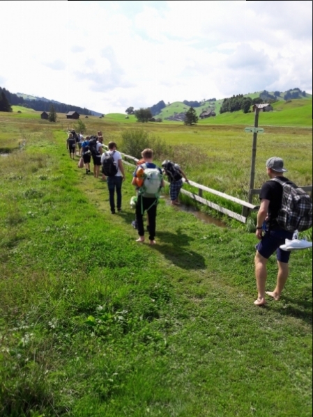 Angekommen in Appenzell, wer hätte das gedacht, ging es Richtung Restaurant los. Dort stärkten wir uns zuerst mit dem Mittagessen. Da wir bereits sehr viel zu Diskutieren hatten, brachen wir mit leichter Verspätung auf. Nach einem kurzen Marsch hiess es dann: «Schuhe ausziehen». Das war natürlich ein Scherz, dachten alle. War es aber nicht. Unsere nächsten fünf Kilometer führten über den Barfussweg. Es war wunderschön so Barfuss über die feuchten, kühlen Wiesen zu Schlendern. Es gab auch Kieswege und Schlammlöcher zu durchqueren. Als wir diesen Weg gemeistert hatten, ging es darum noch für den Abend einzukaufen. Die Idee war, dass wir uns mit Grillieren einen schönen Abend machten. Auch das Lagerhaus für die Übernachtung fanden wir auf Anhieb. Alle waren schon etwas müde vom Marschieren und freuten sich auf das Bier während dem Grillieren. Plötzlich kündigten die Reiseleiter noch eine Attraktion an. Wir sollten eigentlich schon dort sein. Rodeln stand noch auf dem Programm. Die 10 Minuten Fussmarsch zur Rodelbahn waren innert Kürze gemacht und wir sassen auch schon auf der Bahn. Einige waren etwas zurückhaltender, andere dagegen forderten die Bahn heraus. So hatte jeder seinen Spass. Das gute war, dass es jeder heil nach unten geschafft hatte, ob in der Einzelfahrt oder der anschliessenden Zweierfahrt.