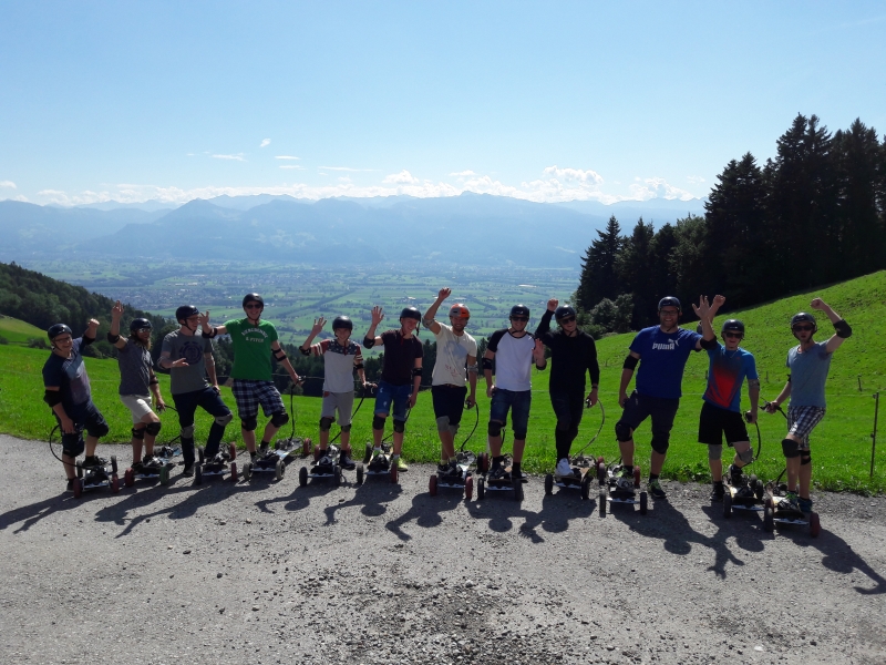Mit einem Büssli wurden wir abgeholt. Nach einer rasanten halbstündigen Fahr auf den Tödi ging es los mit der Talfahrt. Das Mountainboard hatte es in sich. Es ist eine Mischung aus Rollbrett und Snowboard, hat aber zum Glück eine Bremse. Mit der geeigneten Schutzausrüstung und angeschnalltem Board fuhren wir Kieswege, Wiese und Strassen Richtung Tal. Es war recht anstrengend und richtig toll. Die Fahrt dauerte dann auch 2.5 Stunden. Nachdem wir die Tour ohne Verletzung überstanden hatten ging es zum Bahnhof. Nach einer kurzen Verpflegung machten wir uns auf den Rückweg.