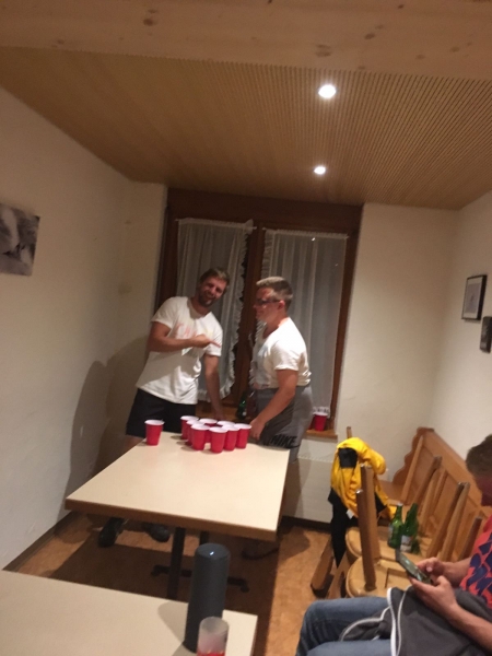 Somit war der erste Tag auch schon durch, beinahe. Wäre da nicht noch das Grillieren. Ob mit Jassen, Diskutieren, Feuern, Bier-Pong oder Holz spalten, jeder fand eine lustige Beschäftigung. Das Fleisch wurde gebrätelt und Salat wurde zusammengemischt. So konnten wir alle zusammen essen. Das Bier dazu durfte natürlich nicht fehlen. Wir hatten das uns ja auch redlich verdient. Den Abend liessen wir dann gemütlich ausklingen. Einige wollten einfach nicht schlafen gehen, und so wurde es am Morgen etwas hektisch mit aufräumen und putzen. Natürlich wollten auch alle noch schnell duschen und sich für den zweiten Tag frisch machen. Das Morgenessen musste dann irgendwann dazwischen eingenommen werden. Wenn jeder gewusst hätte, was am Sonntag noch auf dem Programm steht, wäre der eine oder andere sicher früher schlafen gegangen.
